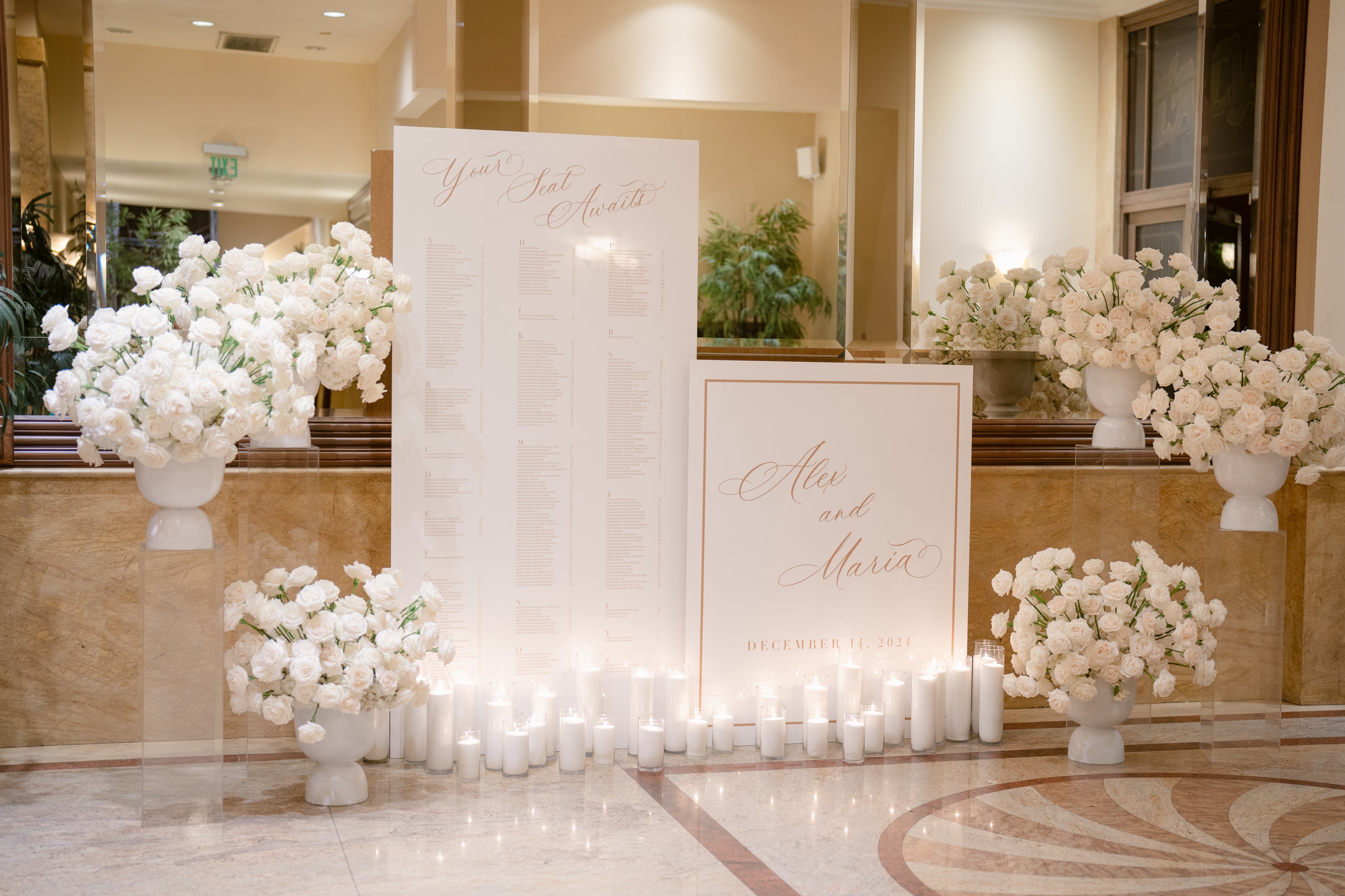 The tablescapes featured lush floral arrangements and carefully staged candles, setting a cozy, intimate mood for their guests. The head table was a true showstopper, with cascading blooms and a sea of flickering candlelight. Even the seating chart was transformed into a stunning focal point, surrounded by elegant floral accents and glowing candles that tied the entire look together.